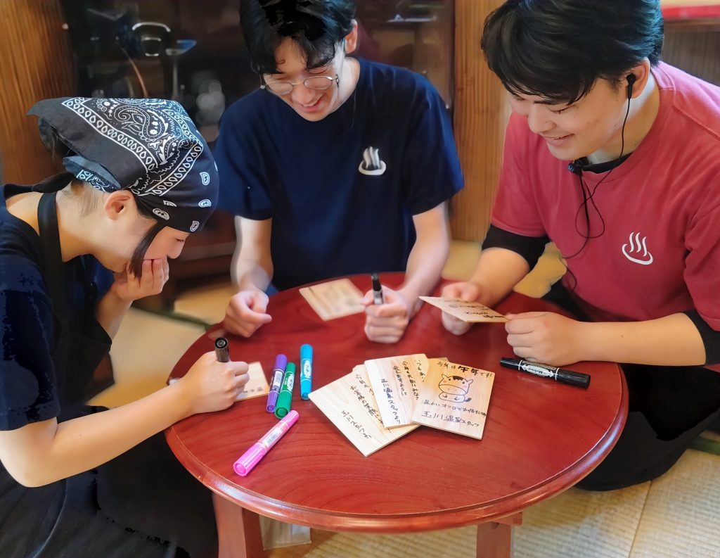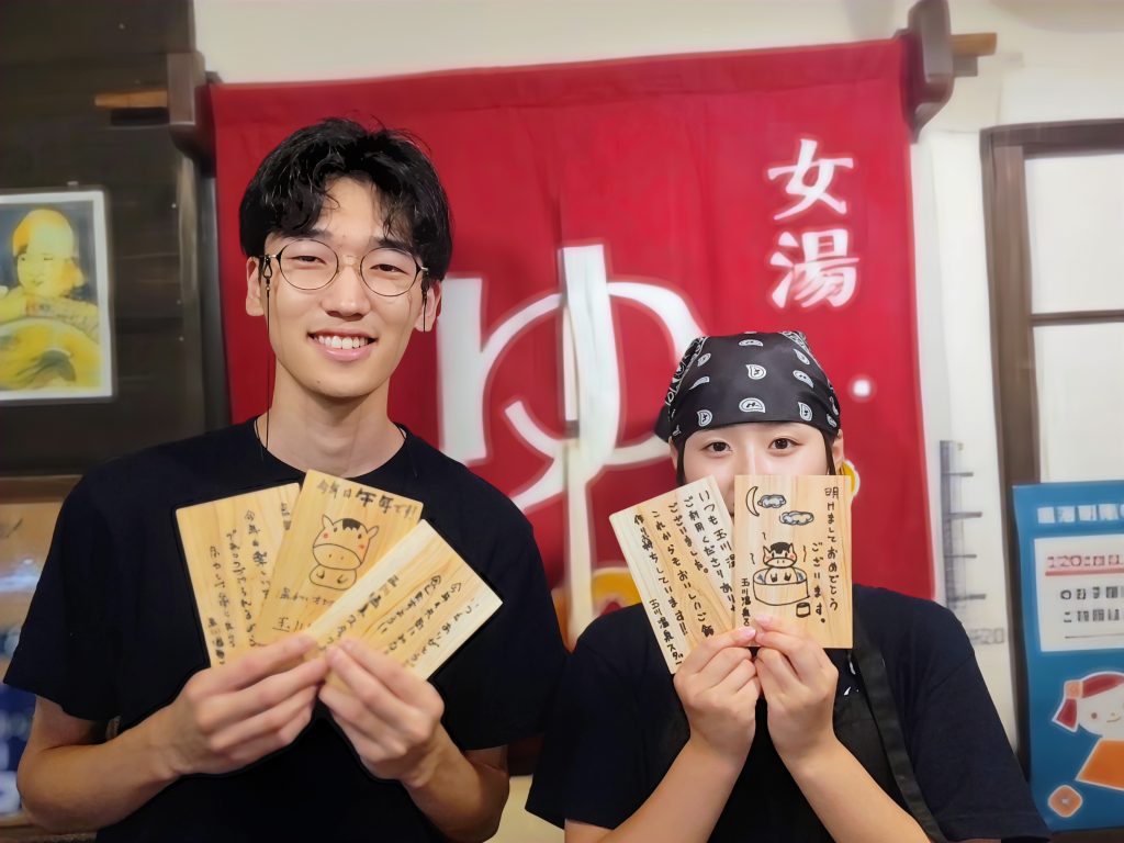お風呂屋さんの従業員が、年賀状に見立てたヒノキでお客様へ感謝と新年のご挨拶をします。