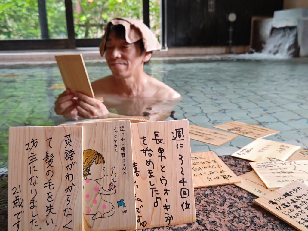 従業員の最近のニュースを書いたヒノキ新聞(入浴木)が男女浴室に浮かびます。入浴木には、玉川温泉のある埼玉県ときがわ町のヒノキ間伐材を使用します。