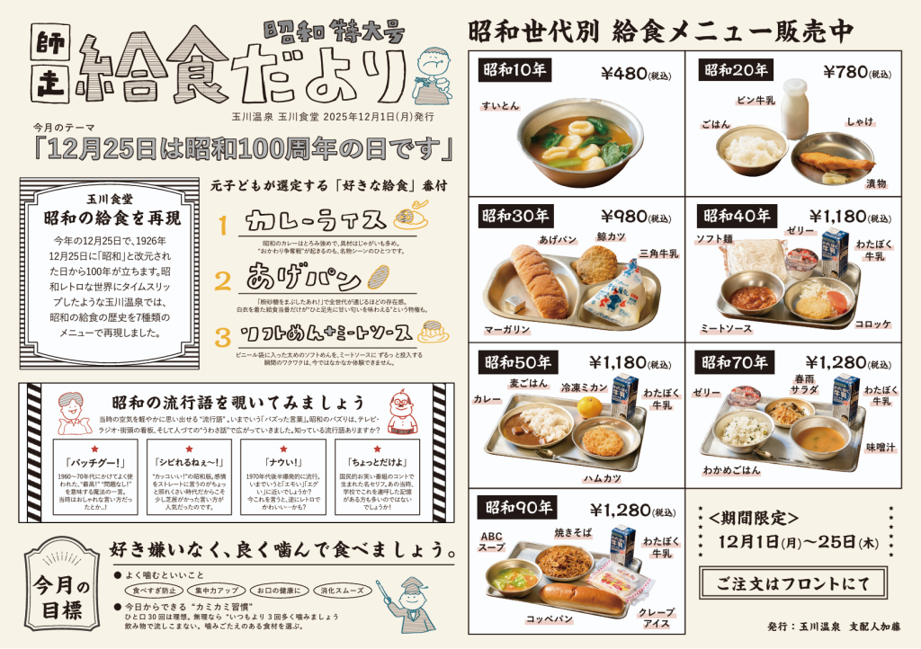 「昭和」と改元された日から100周年目の2025年12月に合わせて、これまでの給食の歴史を7種類のメニューで再現し提供します。時代ごとの食文化、素材の特徴を活かした、当時の給食の味をお楽しみください。