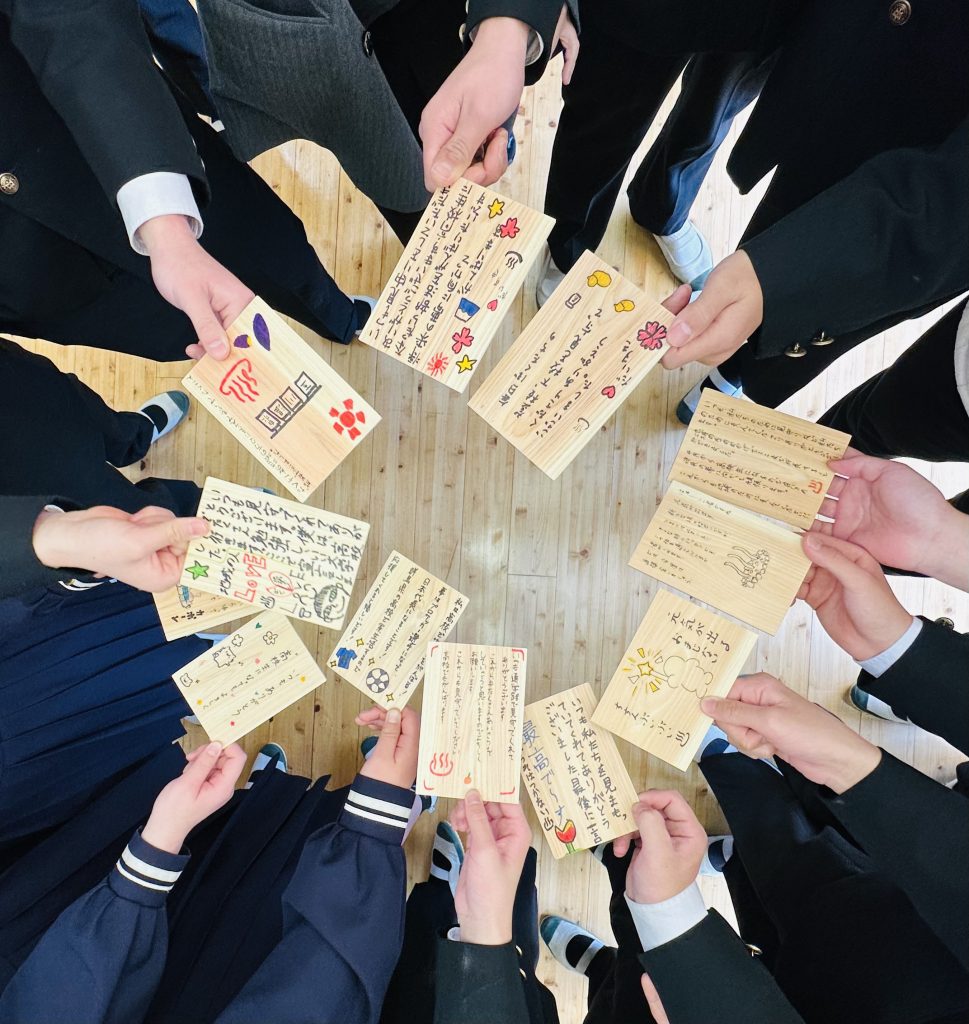 イベント開催に先駆けて、地元の中学校を訪問し、今年の卒業生に「地域の方に向けた感謝のメッセージ」をヒノキの入浴木に書いていただきました。